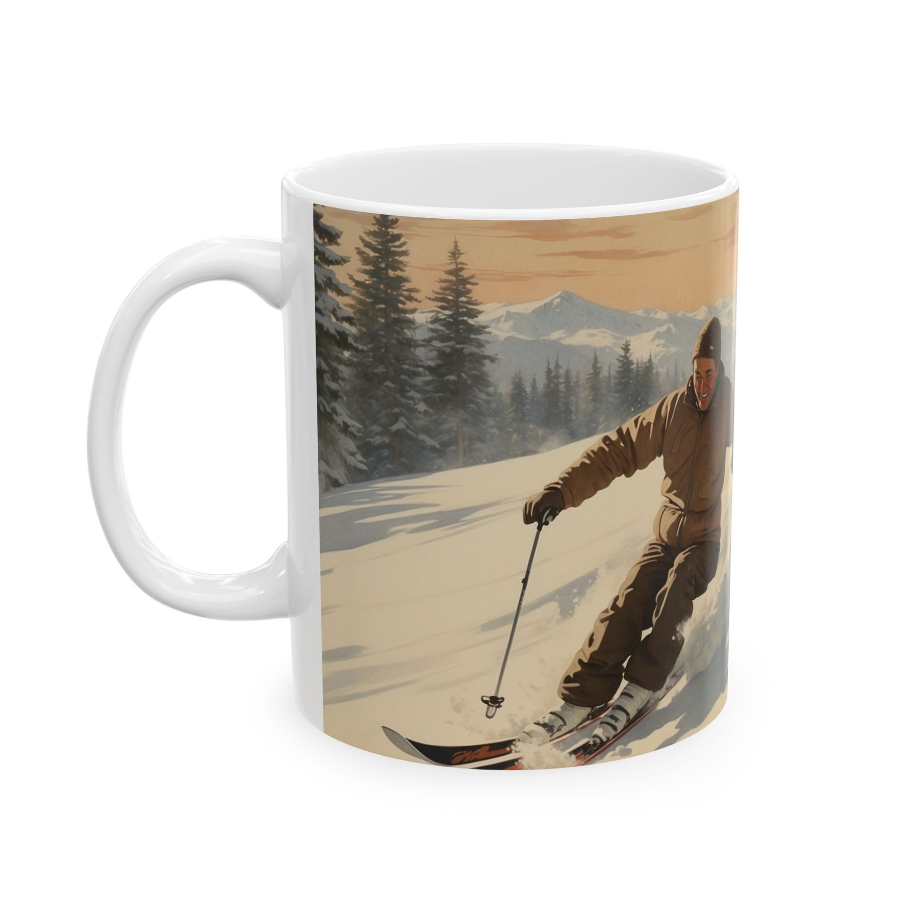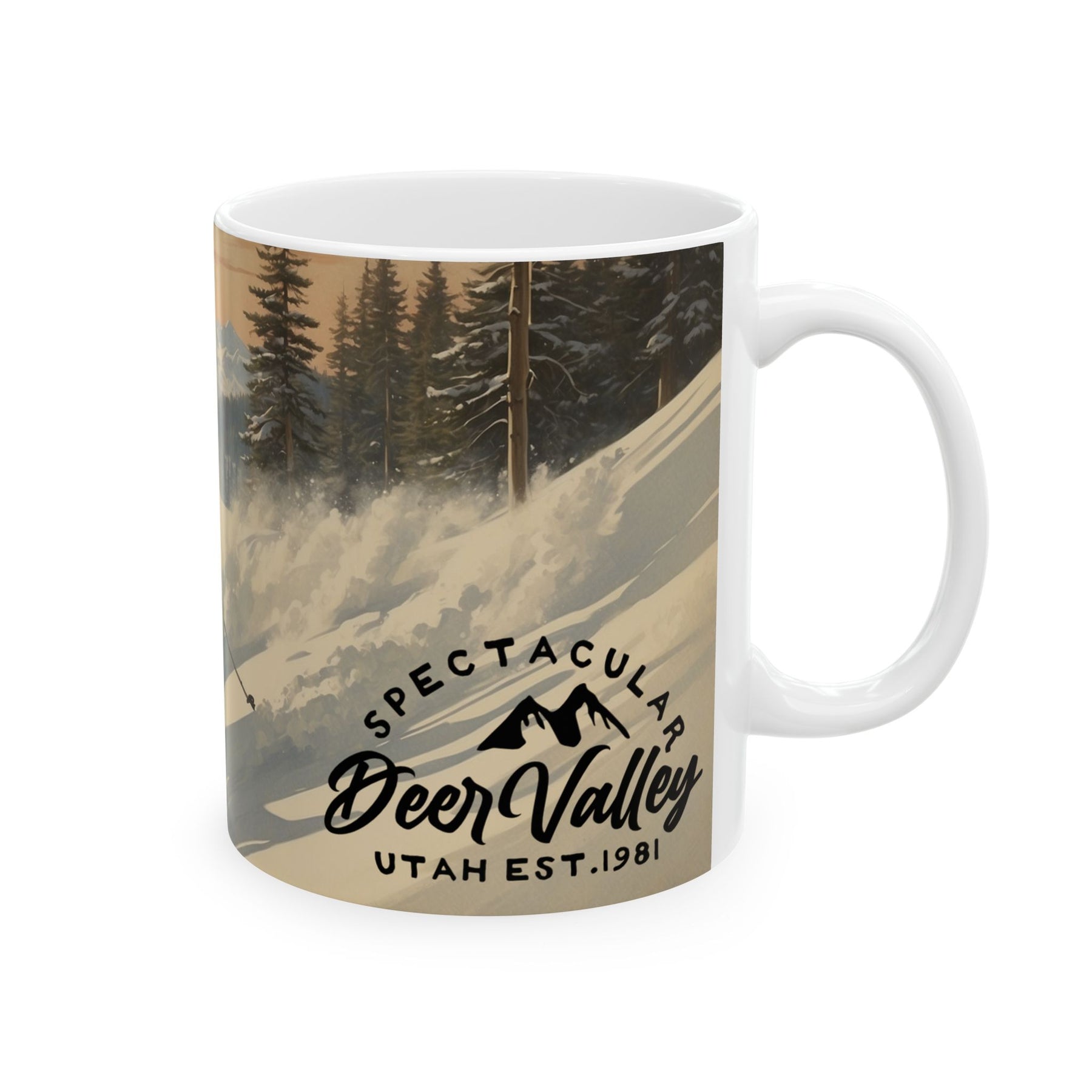 Embark on a journey to the spectacular slopes of Deer Valley, Utah. Our vintage-inspired design transports you to the majestic beauty of Deer Valley, capturing the thrill of downhill skiing and amidst the breathtaking scenery. Take a moment of cozy respite amidst your day by pausing for a warm beverage while you relive the thrill and coziness of Deer Valley's scenic slopes.